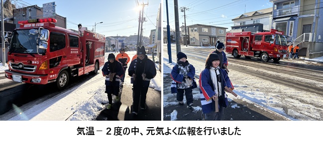 当日はクラブ員たちが松葉通りで拍子木を打ち鳴らして火の用心を呼びかけました。気温が低い中での広報活動でしたが、子供たちの元気な声が届き店先に出てクラブ員の広報に興味深く耳を傾ける町民の方も見られました。