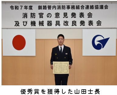 優秀賞に選ばれた山田士長は、1月16日(金)に釧路市消防本部で開催される「第50回道東地区消防職員意見発表大会」に出場することとなりました。