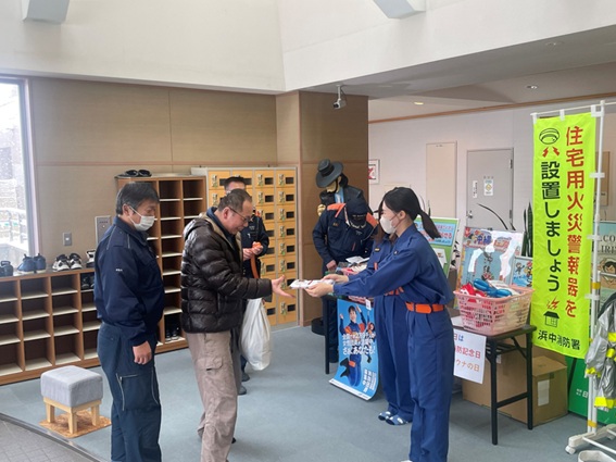 当日は、雪が降る悪天候でしたが、住宅用火災警報器に関するパネルを設置し、来館者に対する設置促進、設置確認を実施するとともに、女性消防団員と消防団員の入団促進を目的として、タオルやチラシを配布しました。